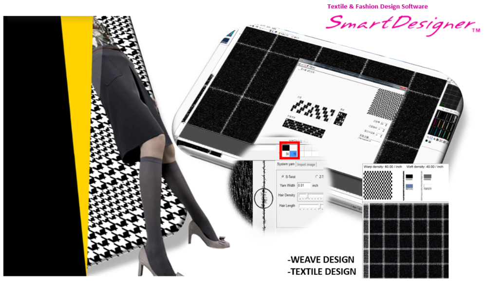 SmartDesigner Weave mode features yarn-dying, brushed effect, twill, thread density, thread organization, thread diameter, and this mode allows users to freely modify their design. In the Weave mode, you cna customize each yarn to your taste and even create melange colors. When designing in weave mode, checked patterns can be created in seconds.
